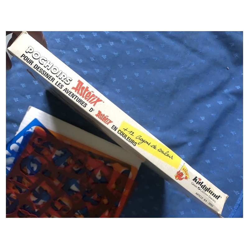 Astérix grande boite de 4 pochoirs de 1991 + 12 crayons de couleurs encore neufs de la marque kiddyland du groupe Christian Duboscq, dimension boite 28 x 22 cm