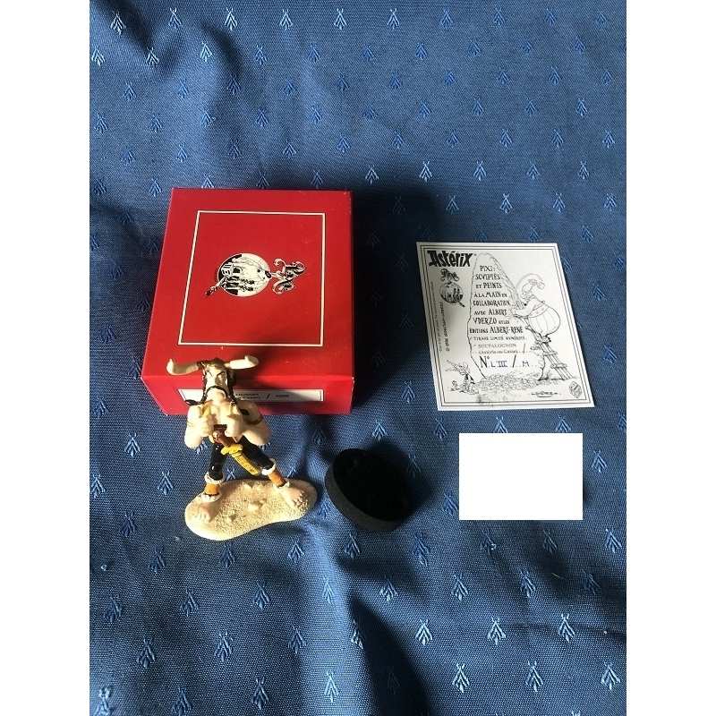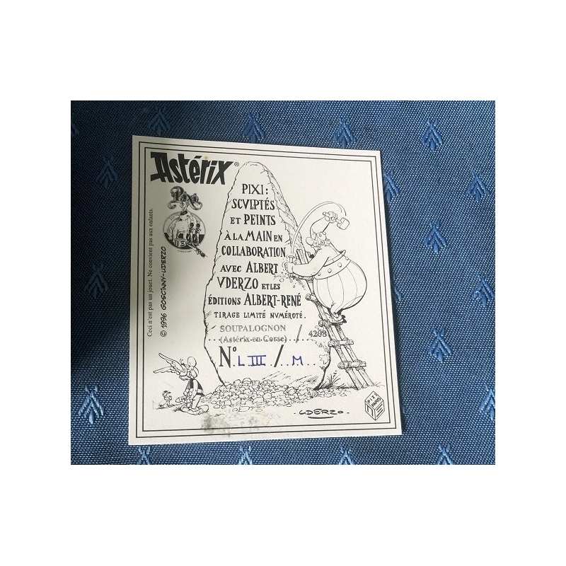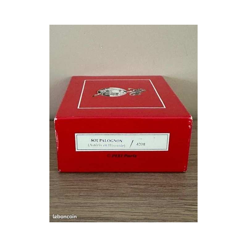 Astérix pixi 4208 soupalognon avec certificat et boite d'origine ( v photo). Tirage total de 1000 exemplaires sauf que vous avez ici le début du tirage avec l'erreur Astérix en corse, ce qui réduit le nombre d'exemplaires de ce pixi a quelques rares unités. Le début du tirage à été commercialisé avec une erreur attribuant cette figurine à l'album " Astérix en Corse " au lieu d'Astérix en Hispanie. L'erreur a été ensuite corrigé mais les quelques premiers envois n'ont pu être récupérer. L'erreur est marqué sur la boite et le certificat (Astérix en corse)